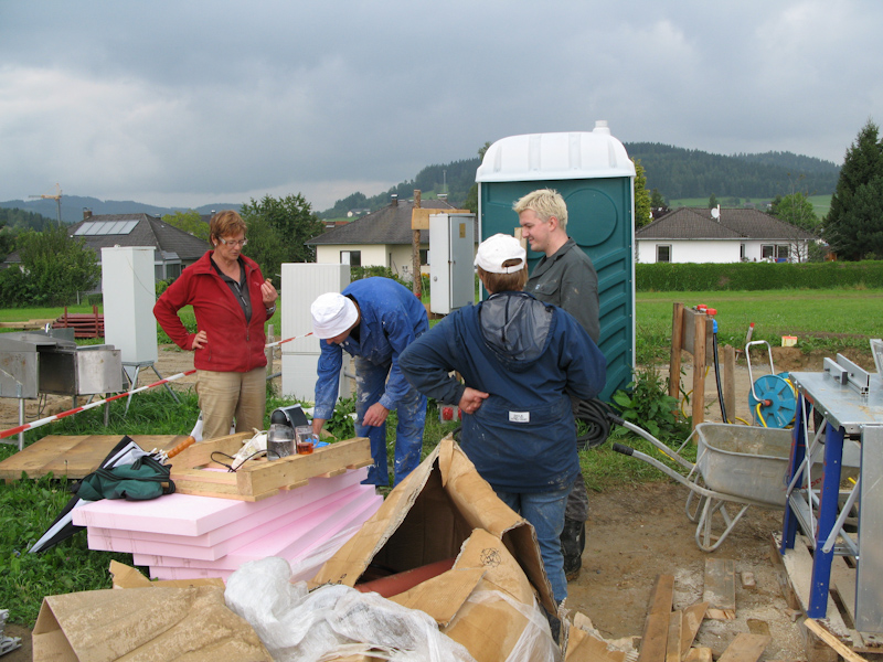 Heute ist die Bodenplatte des Hauses dran: Zuerst wird die Bodenplatte isoliert. Manfred achtet besonders auf die farbliche Gestaltung der Isolierung. Es gibt Platten in gelb und rosa; wir können nun behaupten, dass unsere Isolierung ein Schachbrettmuster hat. Sieht zwar keiner, aber wer hat, der hat.