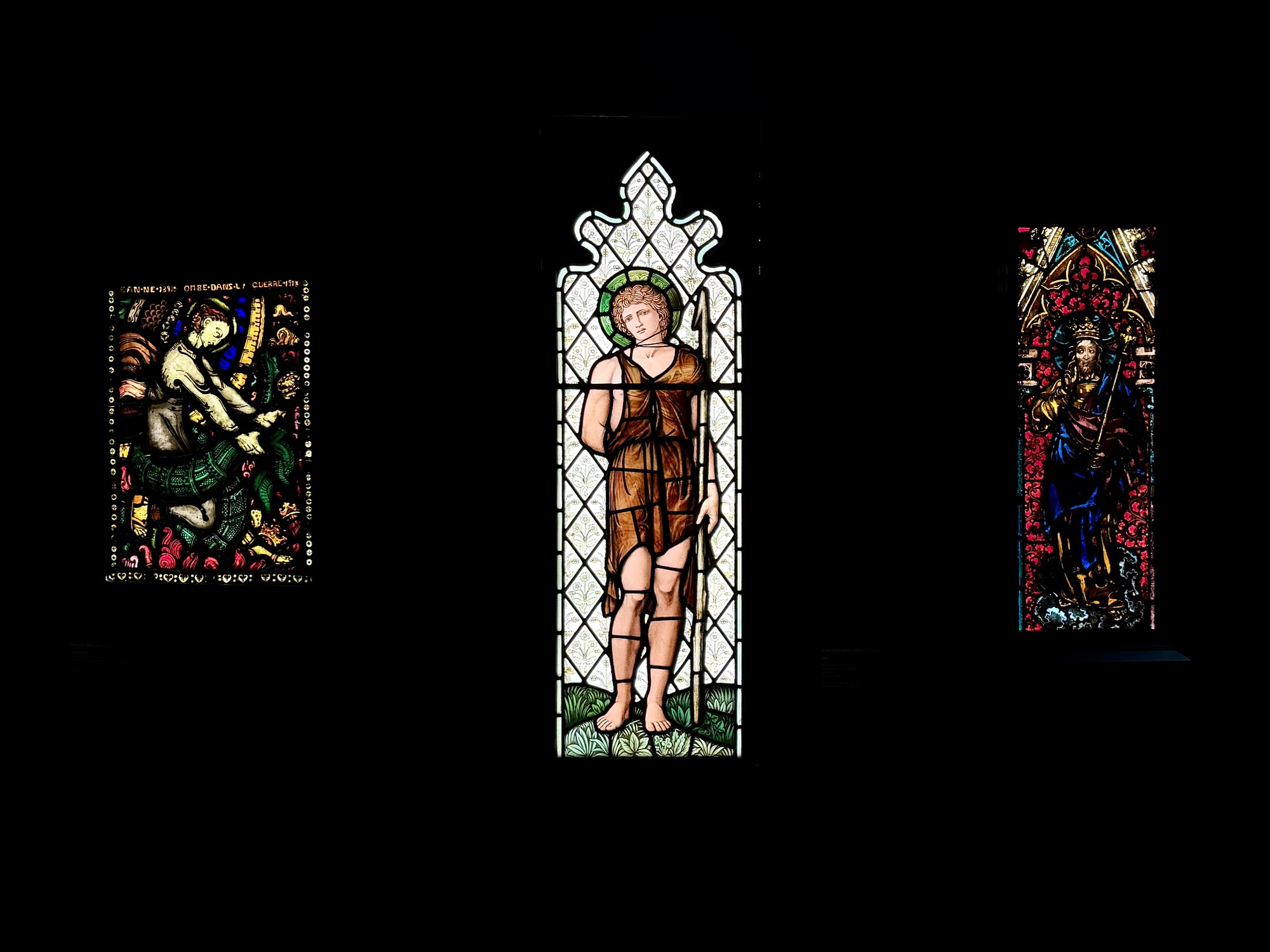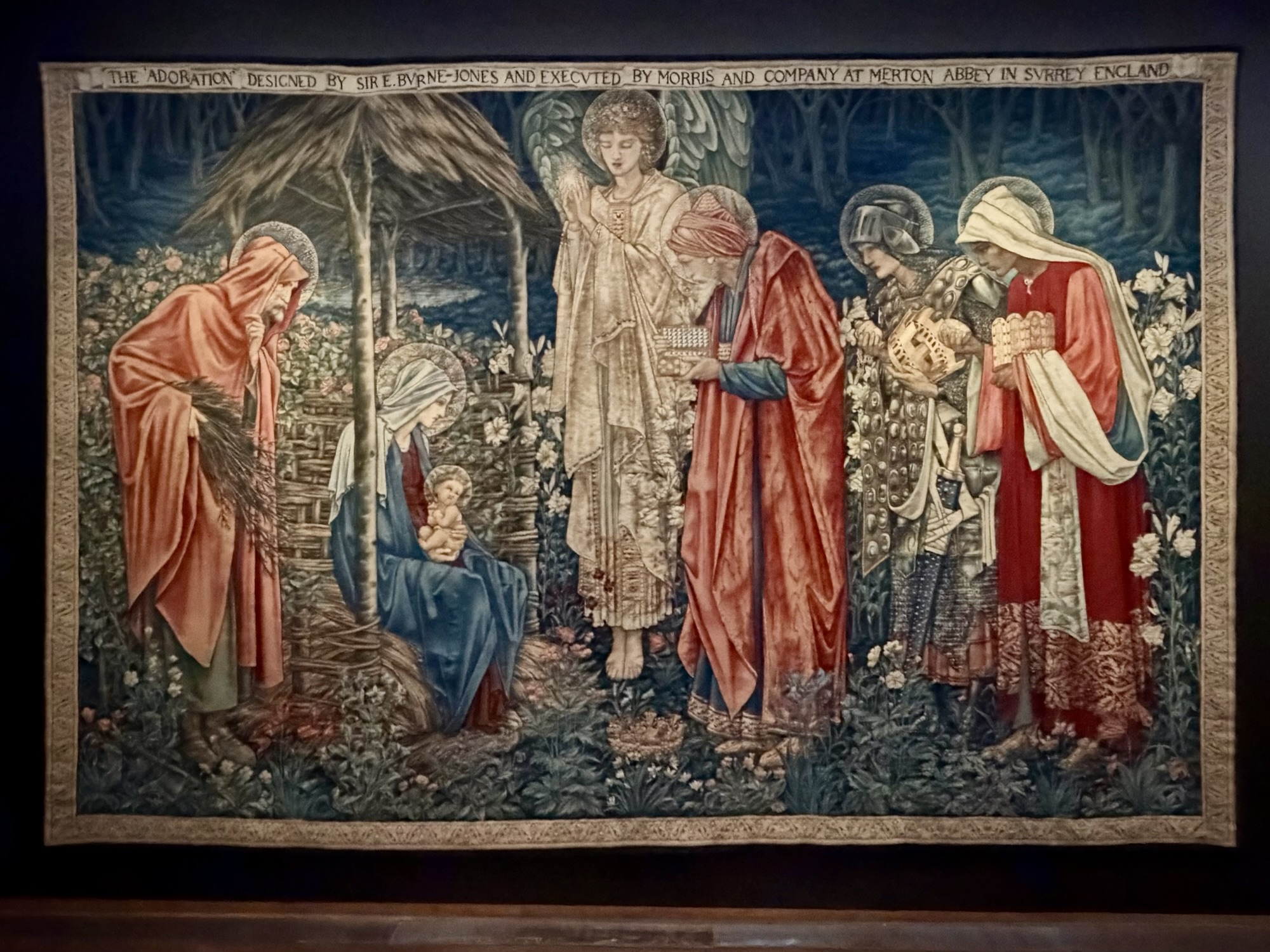 Ein monumentaler Wandteppich mit neutestamentarischen Szenen wurde erst Ende des 19. Jahrhunderts von Edward Burne-Jones entworfen. Religiöse Motive wie Kreuzigungen oder Pietà-Darstellungen ziehen sich durch die Jahrhunderte und werden gegenübergestellt.