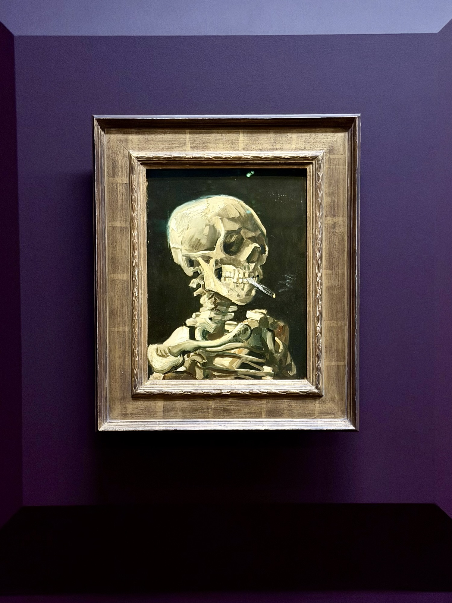 Am Ende begegnet mir der Tod: Als Skelett, Engel oder Greis. Zu sehen ist auch ein Frühwerk von Vincent van Gogh, entstanden während seiner Zeit an der Kunstakademie in Antwerpen: Ein grinsendes Skelett, das lässig eine Zigarette raucht. Der Totenschädel wirkt fast cool. Lange wurde das Bild als studentischer Scherz abgetan, hier wird es den mittelalterlichen Totentanz-Darstellungen gegenübergestellt. Diese zeigen Skelette, die Menschen aller Schichten mit sich fortreißen – düstere Reaktionen auf Pest und Vergänglichkeit.