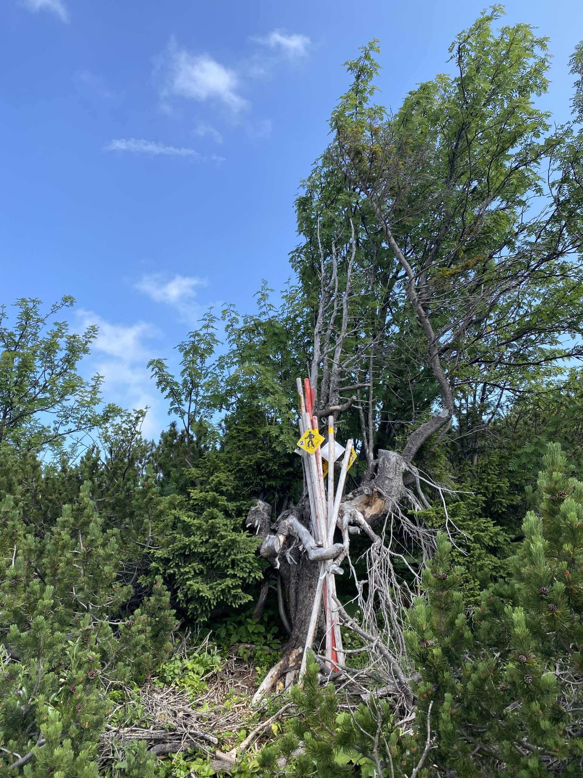 Von der Bergstation der Seilbahn folgen dem Wanderweg 820 und dann 835 zur Aussichtskanzel Alberfeldkogel. Der Weg folgt zuerst einem geschotterten breiten Weg, der schließlich in einen steinigen Weg mündet. Wir sind etwas überrascht von der Wegbeschaffenheit im oberen Teil. Blumenwiesen und Latschenwälder säumen den Weg; der Weg selbst verlangt Martinas schlechtem Gleichgewichtsgefühl einiges ab. Wir kommen trotzdem gut voran und stehen (inkl. einiger Pausen) nach etwa 50 Minuten am Gipfelkreuz des 1.707 m hohen Alberfeldkogels.