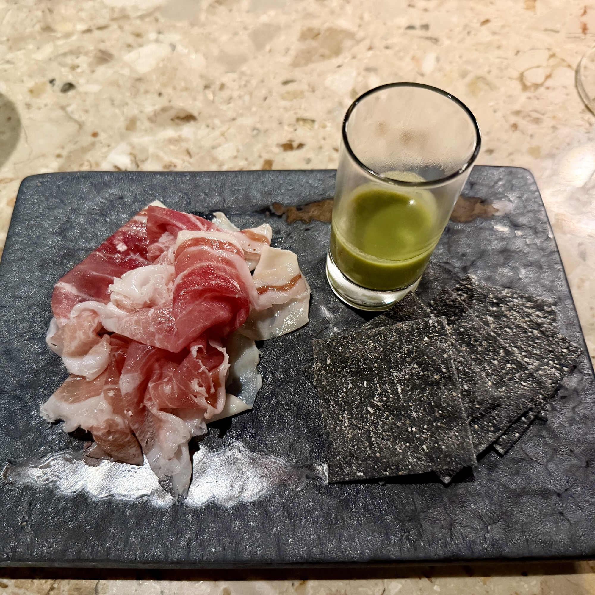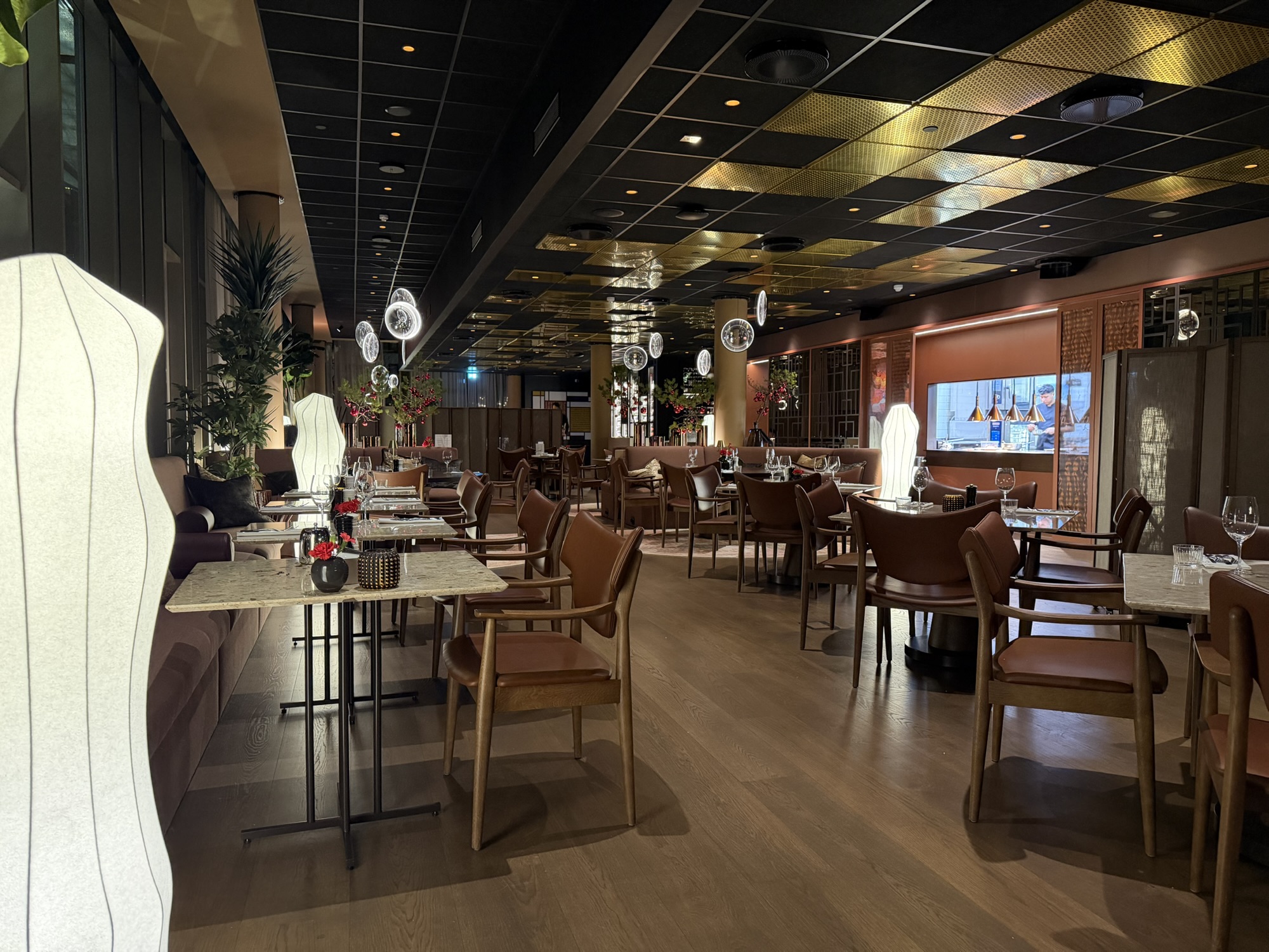 Das Ambiente gefällt uns schon einmal: Der Raum ist gemütlich und einladend, einzigartige Kunstwerke wie das Gemälde Spin von Damien Hirst bilden einen beeindruckenden Rahmen.