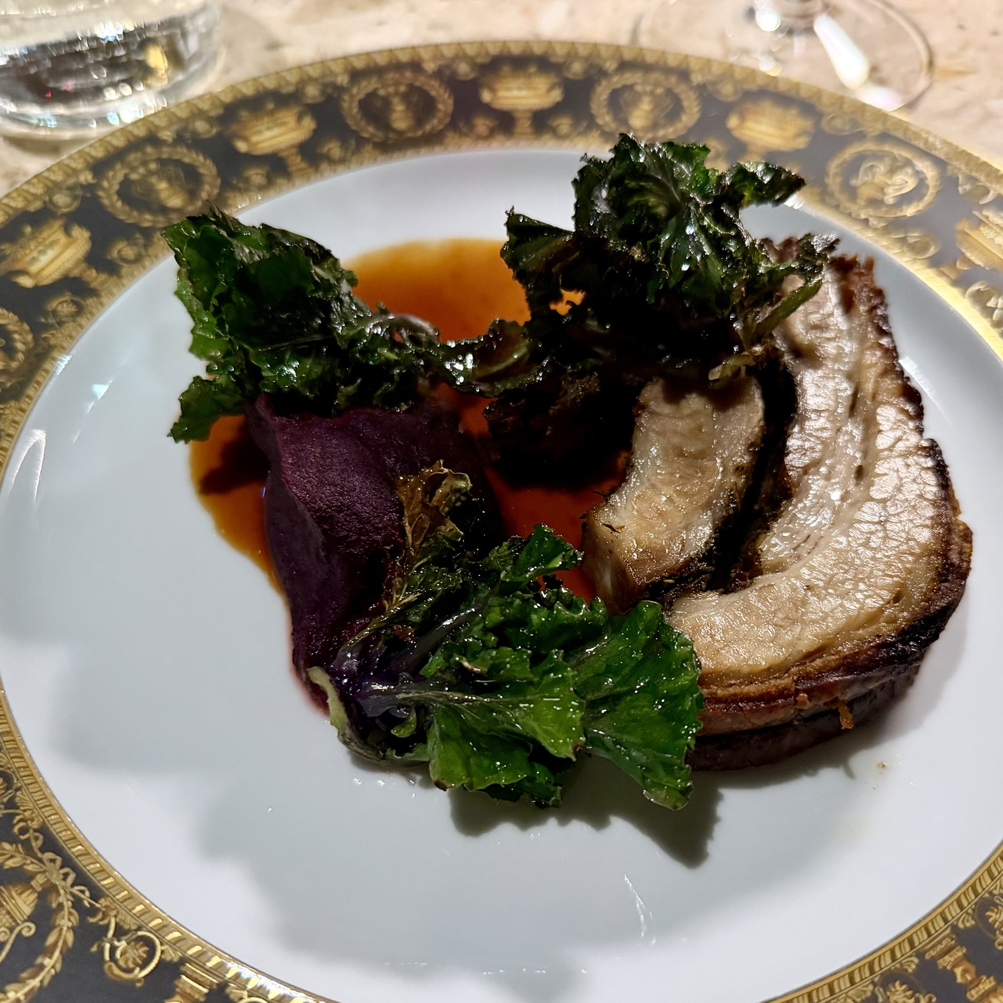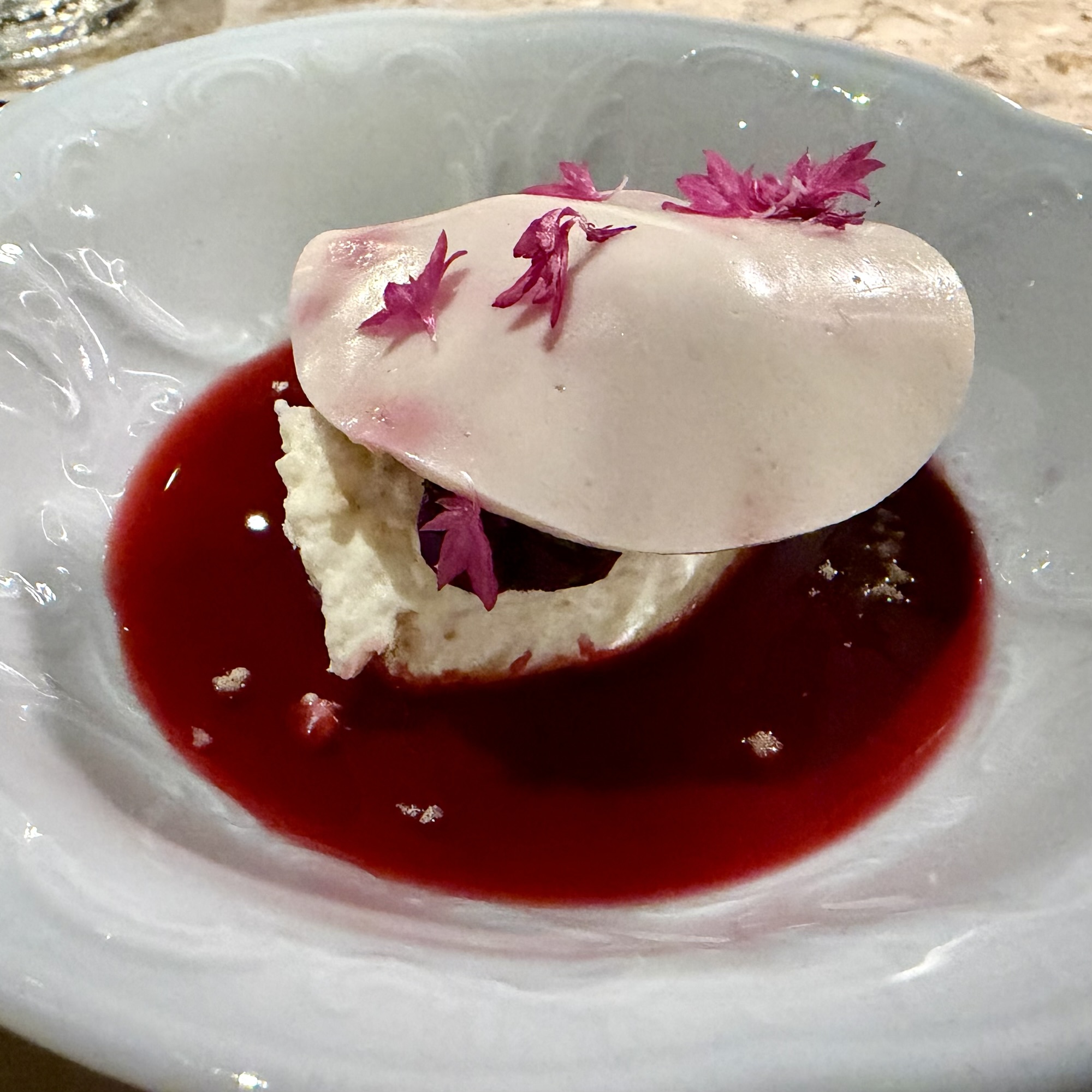 Pochierte Kirschen, Milchreis, Krumkake-Streusel, Kardamom-Kirschen-Sauce