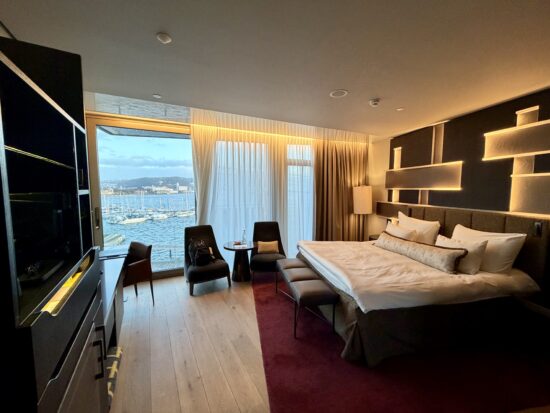 Nach einem entspannten Check In beziehen wir unser Zimmer. Die bodentiefen Fenster und der private Balkon bieten eine unglaubliche Aussicht auf den Fjord und auch die Gestaltung des Zimmers lässt keine Wünsche offen.
