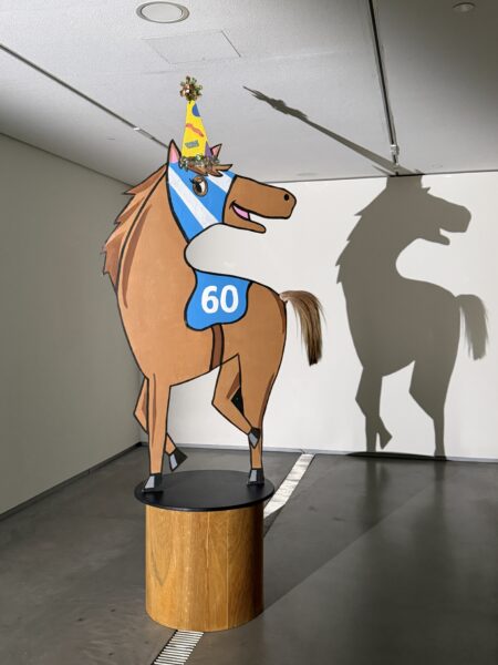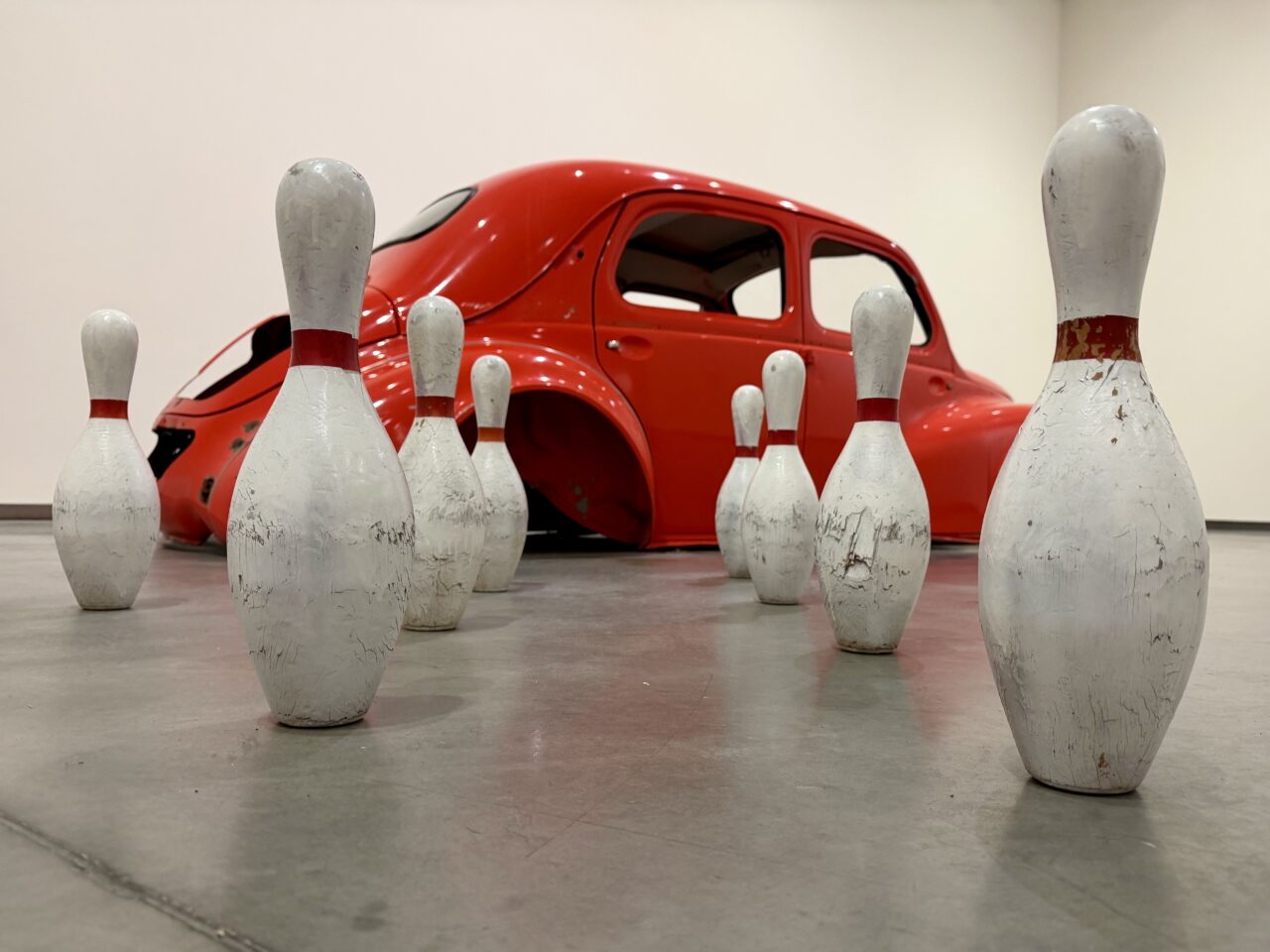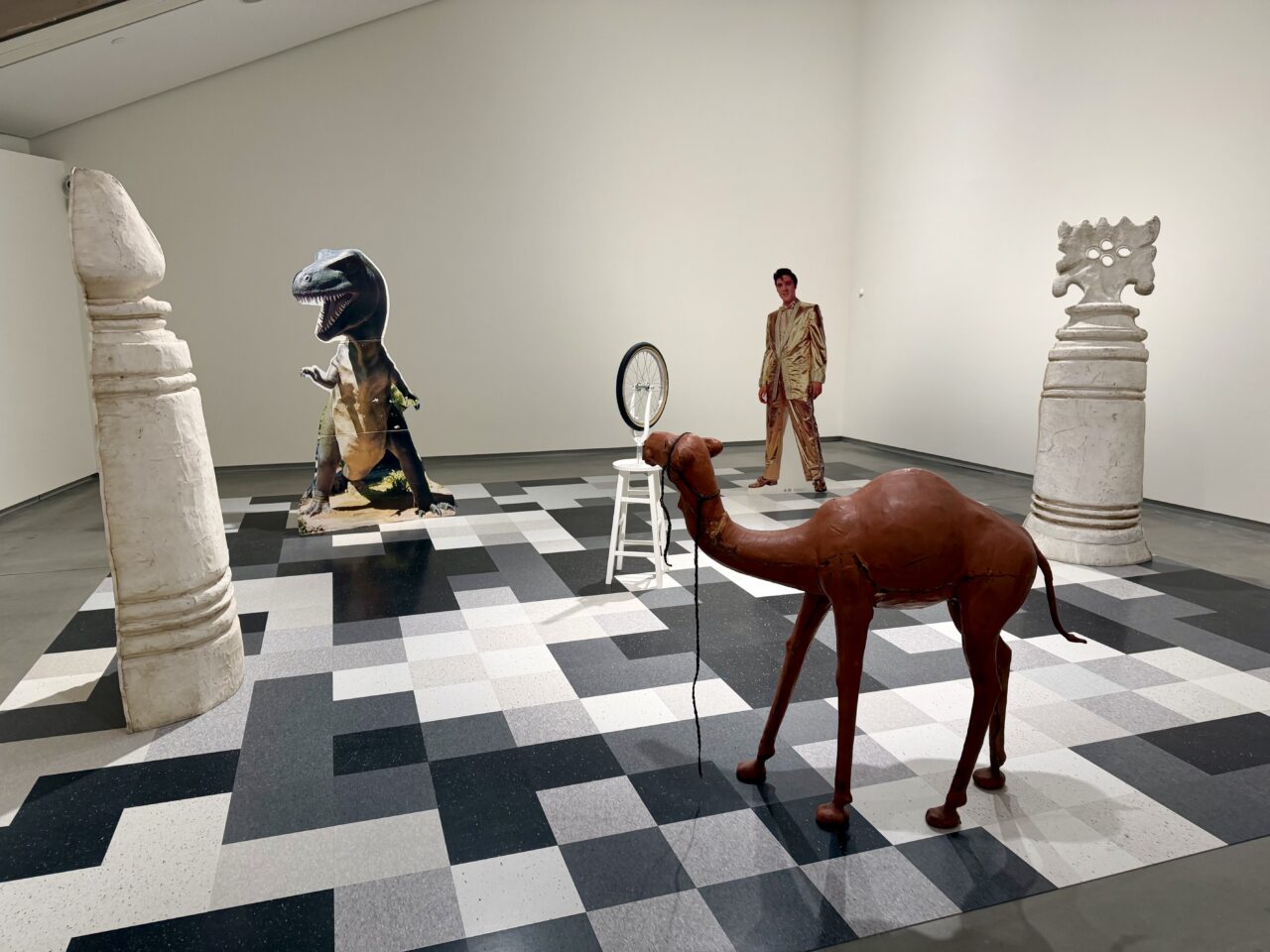 Immer wieder sieht man überraschende Objekte. Ein lebensgroßes Schachbrett präsentiert flache und dreidimensionale Spielfiguren – einen Papp-Elvis, halbierte Türme und halb runde Bauern.