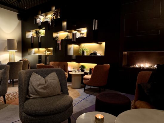 Im hinteren Teil des Hotels befinden sich zusätzliche Loungesessel an der Hotelbar, und das beleuchtete Barregal im Hintergrund ist beinahe selbst ein Kunstwerk.