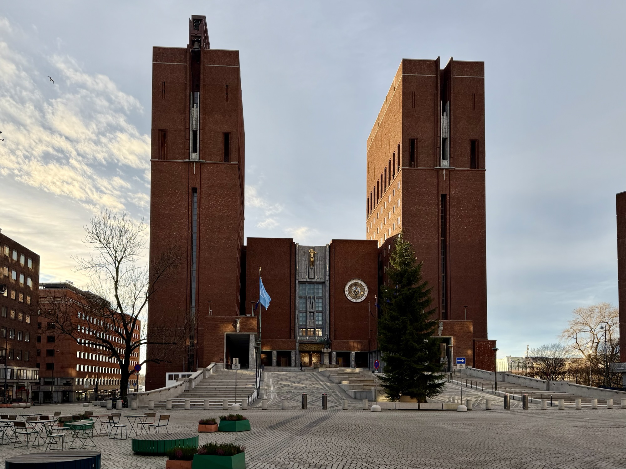 Danach folgten wir der Promenade bis zum Rathaus (Oslo rådhus), erbaut zwischen 1931 und 1950. Seit 1990 wird hier jedes Jahr am 10. Dezember der Friedensnobelpreis verliehen.