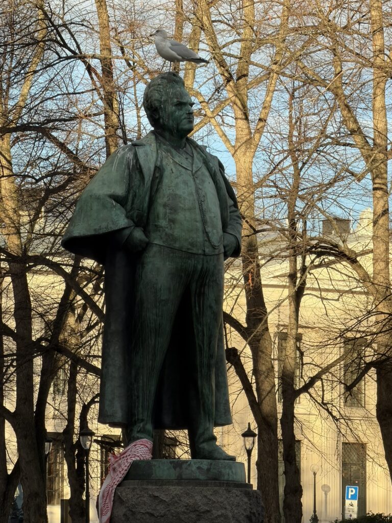 Vor dem Gebäude befinden sich Bronzestatuen von Ibsen und Bjørnstjerne Bjørnson – beide wichtige Vertreter des literarischen Realismus und Nobelpreisträger.