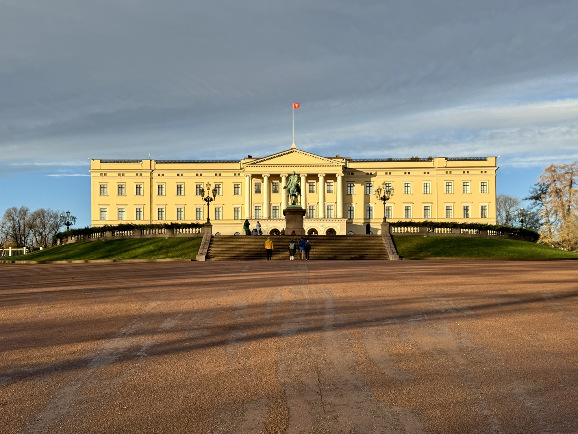 Der Weg führt uns weiter zum Königspalast (Det kongelige slott), der zwischen 1824 und 1849 erbaut wurde. Der Palast ist bis heute der offizielle Wohnsitz der norwegischen Königsfamilie und Amtssitz von König Harald V.. Er ist vergleichsweise schlicht gehalten und liegt auf einem kleinen Hügel, dem Slottsparken.