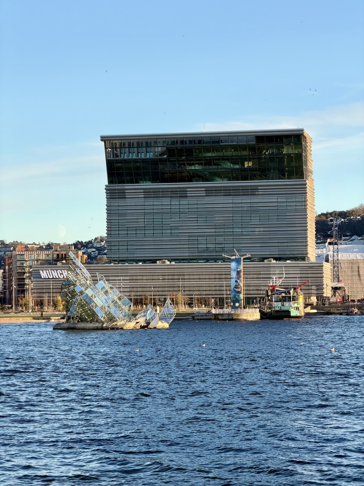 Anschließend gehen wir weiter zum Munch-Museum. Etwas wie ein schiefer Turm ragt der Glasbau über dem Fjord. Das Gebäude ist 13 Etagen hoch und zeigt über 26.000 Werke des norwegischen Malers Edvard Munch (1863–1944). Munch vermachte sein Gesamtwerk testamentarisch der Stadt Oslo.
