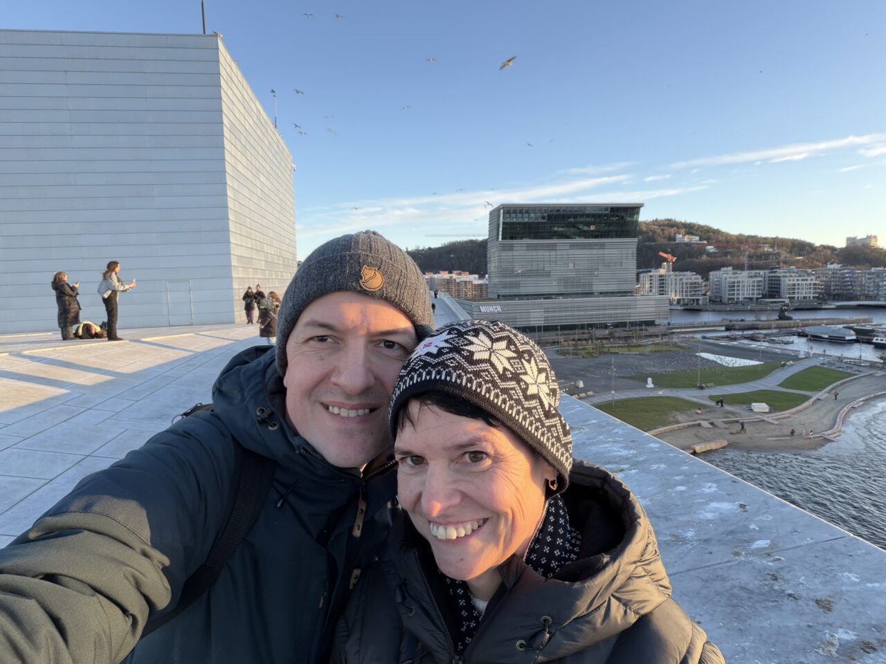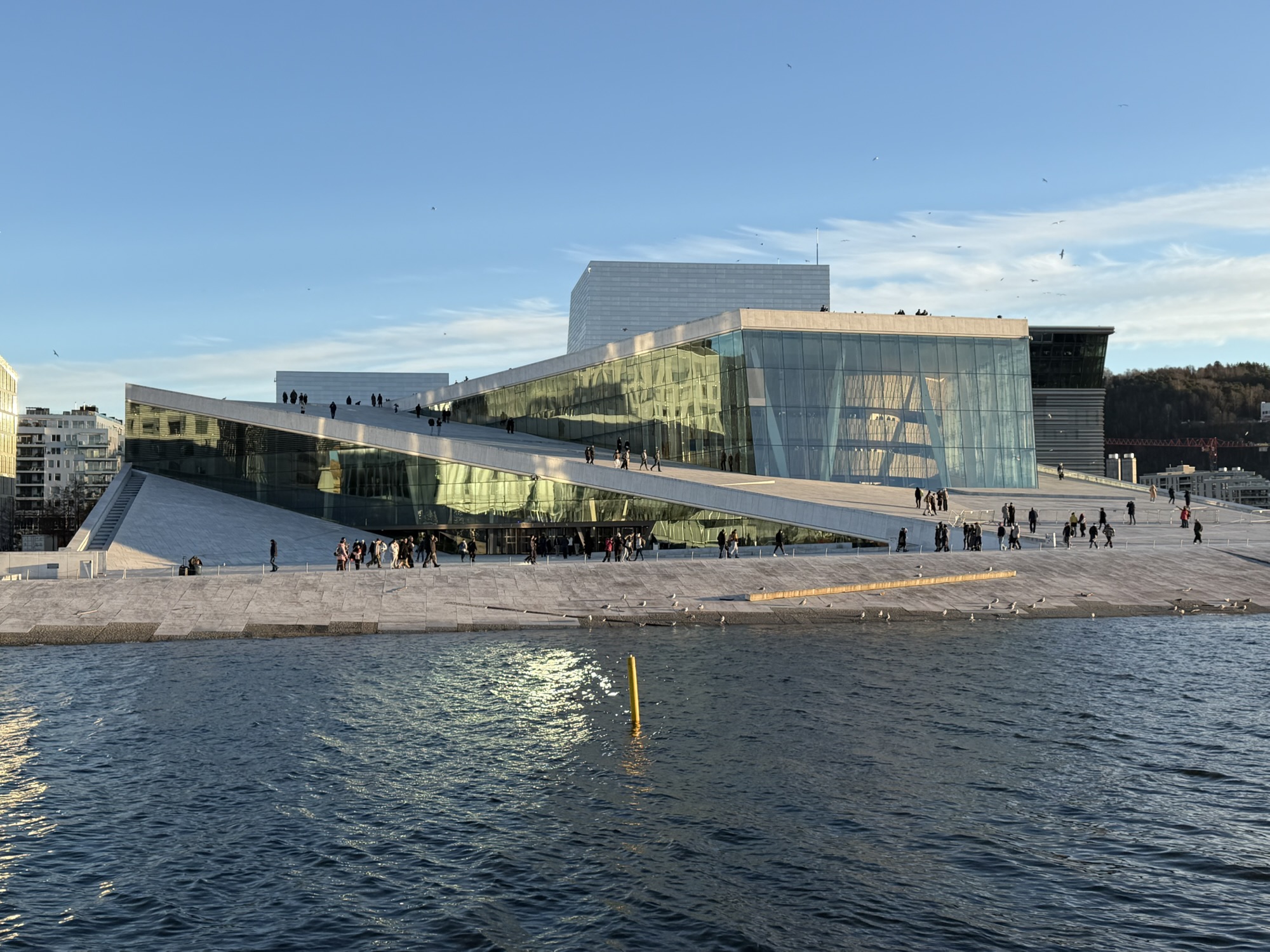 Danach besuchten wir das Opernhaus Oslo, eröffnet 2008, entworfen vom norwegischen Architekturbüro Snøhetta. Es gilt als Symbol für die moderne Seite Oslos. Das Gebäude ist begehbar – wortwörtlich. Man kann auf das Dach, das sich wie eine Rampe in den Fjord schiebt, hinaufsteigen. Heute ist das etwas kalt; aber wir haben einen großartigen Blick über die Stadt und das Wasser.