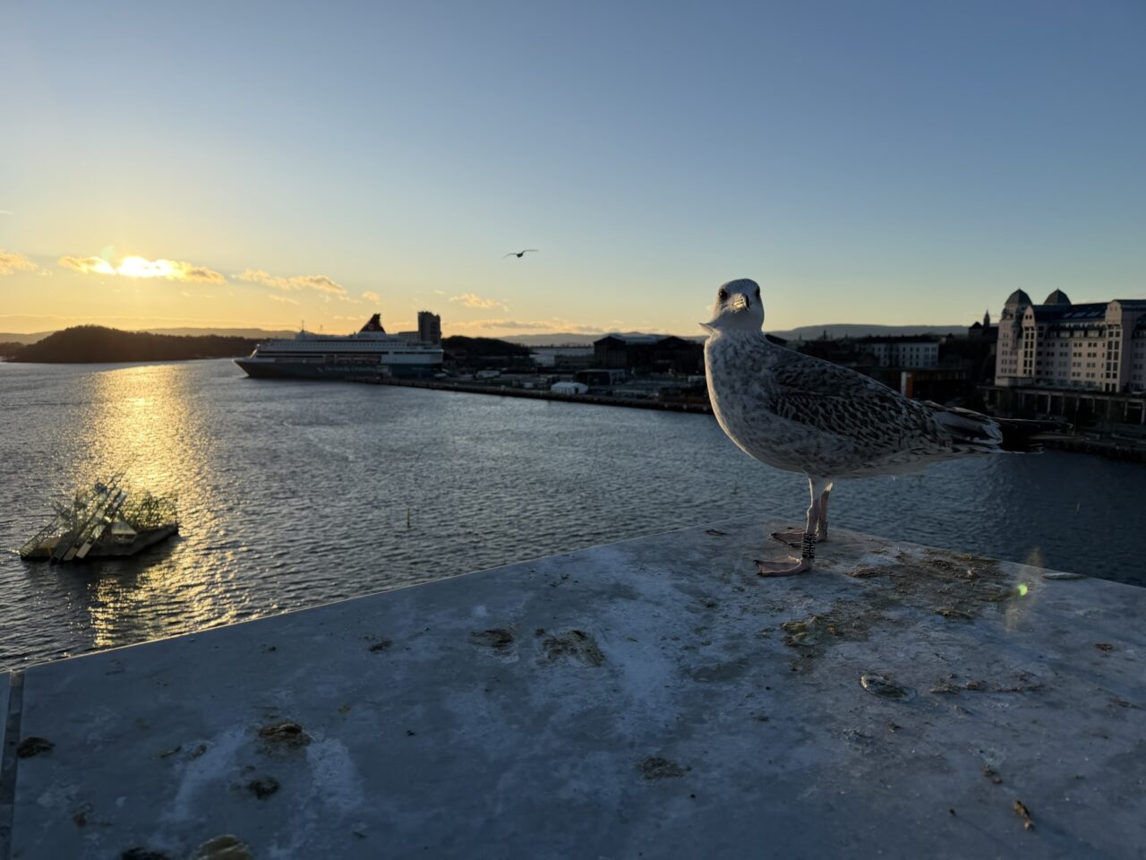 Unser Ziel ist zuerst das oberste Stockwerk, wo sich die Bar Kranen befindet. Wir ergattern einen Tisch im Eck direkt am Fenster. Wir haben einen fantastischen Blick auf Bjørvika und können den Möwen aus der Vogelperspektive zusehen.