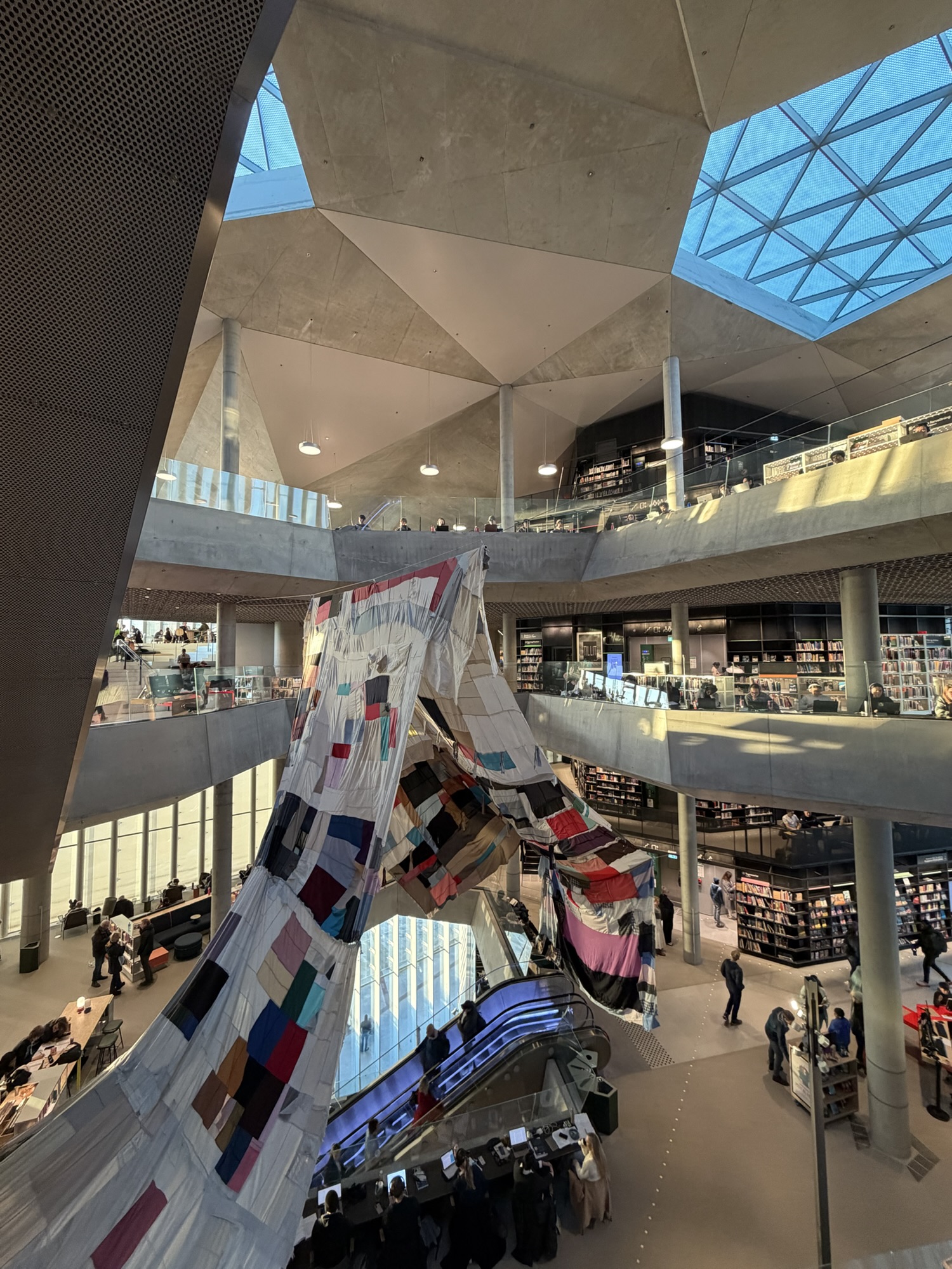 Die gleiche Aussicht – nur zusätzlich mit einem Blick auf das dramatisch geneigte Dach des Opernhauses – bietet die neue Hauptbibliothek. Bequeme Sitzgelegenheiten, ein Café, Gemeinschaftstische und eine Kinderabteilung sorgen dafür, dass es sich hier sehr einladend anfühlt.