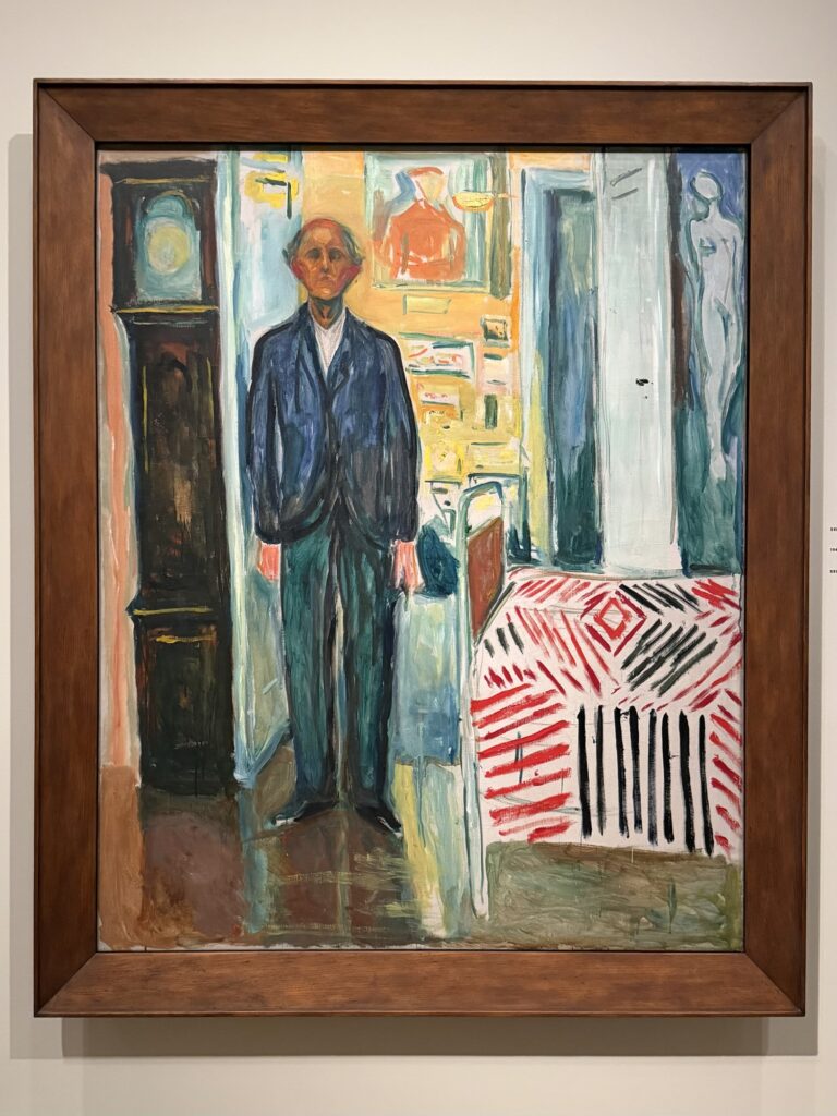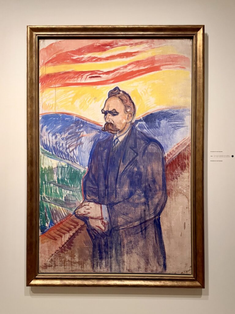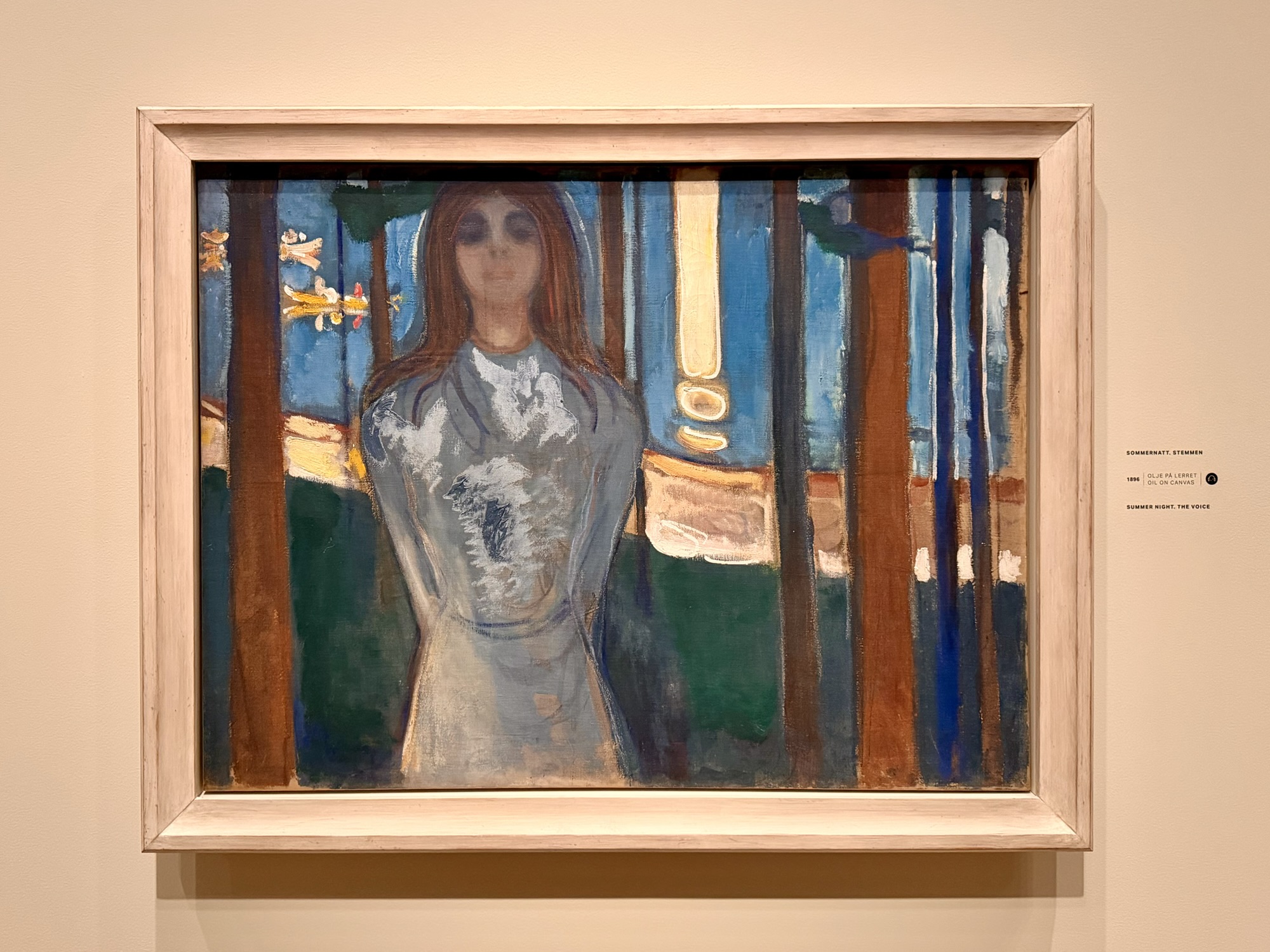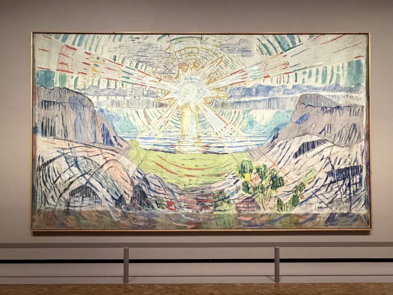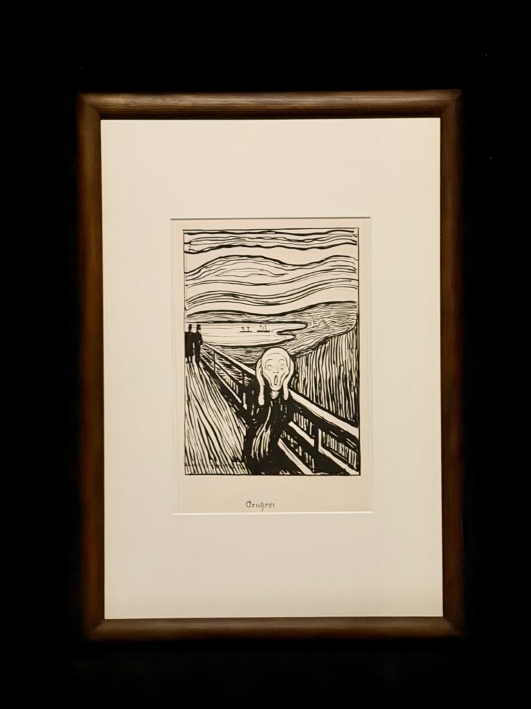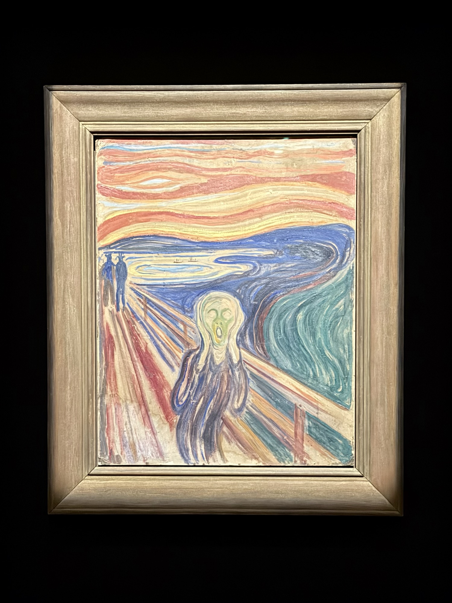 Unseren Rundgang beginnen wir im Highlights-Bereich, der Munchs berühmteste Werke zeigt. Im Mittelpunkt steht natürlich das bekannteste Bild des Künstlers: Der Schrei. Es gibt nicht nur eine Version – Munch schuf mehrere Fassungen, in Öl, Pastell und Tempera. Das ikonische Motiv entstand 1893, inspiriert angeblich von einem Moment der Angst als Munch während eines Spaziergangs am Oslofjord plötzlich das Gefühl hatte, die Natur um ihn herum würde schreien.