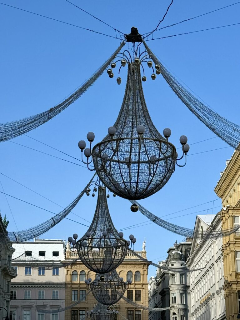 Die Innenstadt ist weihnachtlich dekoriert; das erleben wir zum ersten Mal. Die Kulisse ist atemberaubend. Am Graben hängen riesige Luster über der Straße, in der Rotenturmstraße sorgen große rote Christbaumkugeln für weihnachtliche Stimmung.
