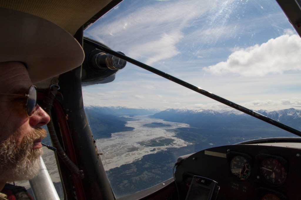 Bei traumhaftem Wetter fahren wir zum Flugfeld, wo eine kleine silberne Propellermaschine für unsere Flightseeing Tour auf uns wartet. Es scheint, als ob Gary nur mehr sehr ausgesuchte Touren fliegt. Im Laufe des Tages sind alle Locals, denen wir davon erzählen, begeistert, dass wir mit Gary unterwegs waren. Und Gary weiß offensichtlich, wie man fliegt. 🙂 Das etwas ältere Flugzeug hat moderne Ausstattung samt GPS und er fliegt meistens freihändig.
