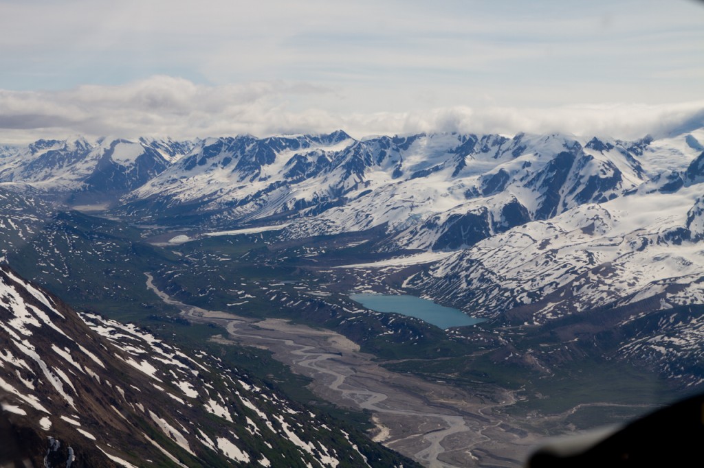 Leider ist es unmöglich, den unglaublich schönen Flug zu beschreiben. Schon nach 5 Minuten Flugzeit sehen wir nur mehr Wildernis unter uns: Flüsse, Bäume, kleine Lichtungen – später dann Berge, Gletscher und türkisblaue Seen.